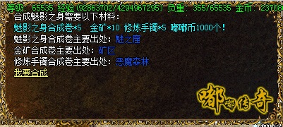 通过盟重左上角的装备合成使者,我们发现.原来魅影之身是需要合成的.那么打出来的装备肯定不是一个完整的.根据要求是魅影之身合成卷5个,再加其他的材料.现在我们重点说说魅影之身合成卷应该怎么获得.