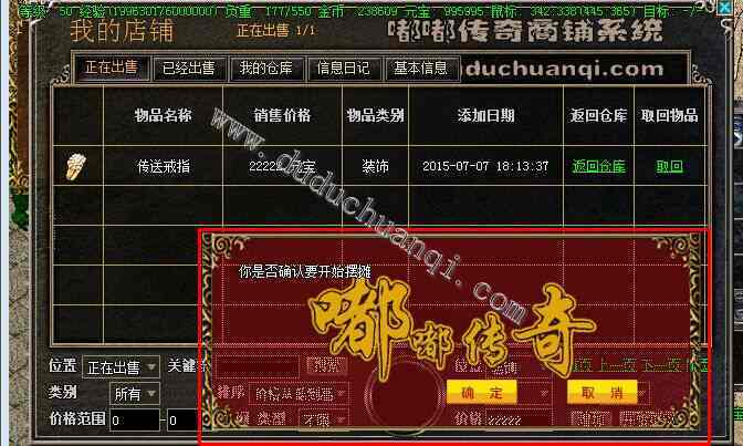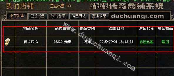 摆摊界面查看。可以看到名字,图片,价格,添加日期等。